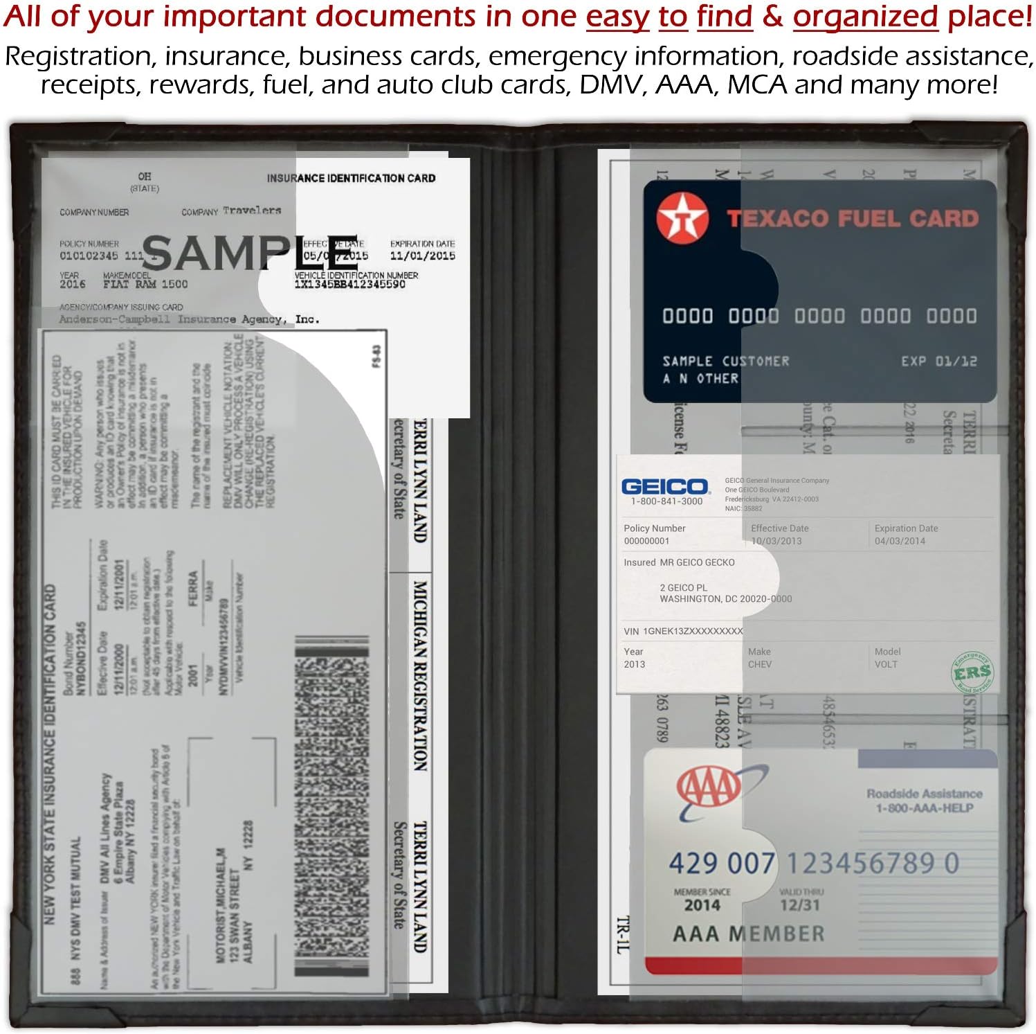 Enough space for all of your important vehicle-related documents including registration & insurance, business cards, emergency information, roadside assistance, rewards, fuel, and auto club cards, DMV, AAA, MCA.