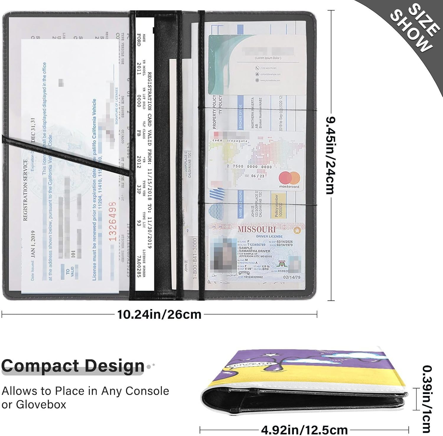 Standard Size & Slim Design — 9.5″ x 5″ x 0.3″. Perfect Fit for Most Glovebox or Console Compartment. 1 Large Pocket for Car insurance. 2 Pockets to Vehicle Registrations Cards. 3 Small Slots Can Fit Other Items.