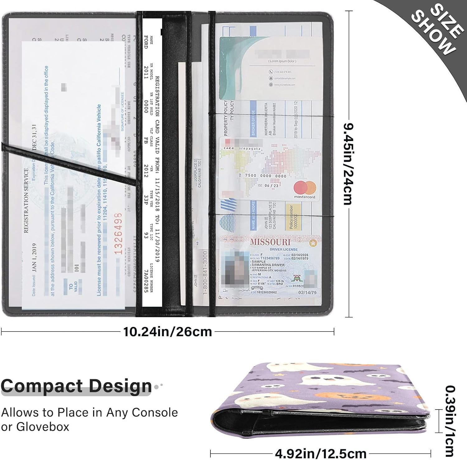 Standard Size & Slim Design — 9.5″ x 5″ x 0.3″. Perfect Fit for Most Glovebox or Console Compartment. 1 Large Pocket for Car insurance. 2 Pockets to Vehicle Registrations Cards. 3 Small Slots Can Fit Other Items.