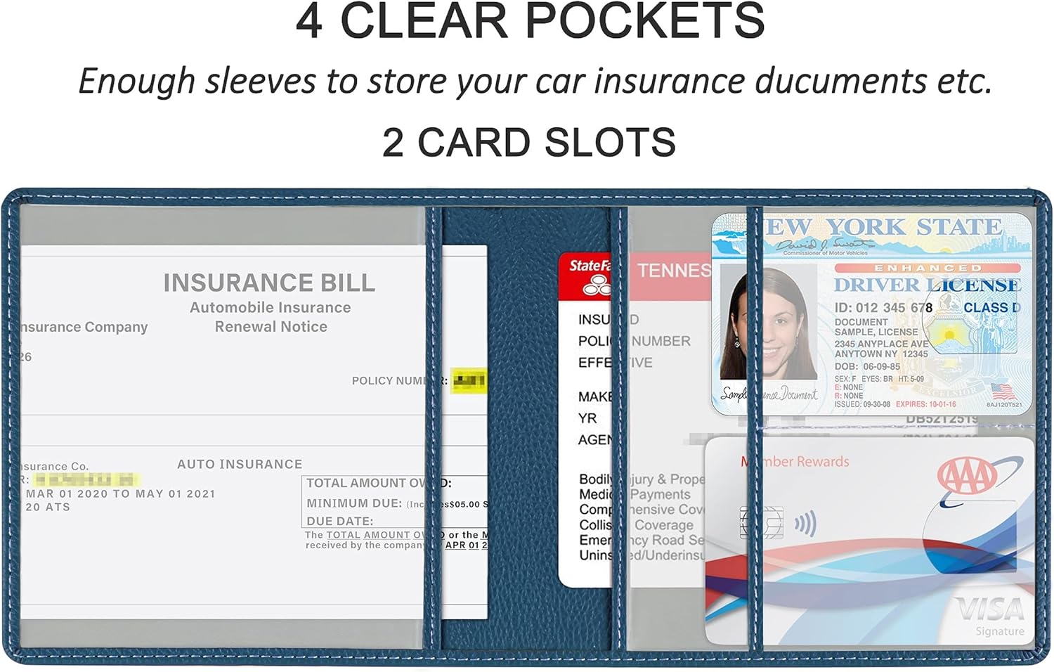 【4 Clear Pockets】2 large pocket for car registration and insurance documents, 2 small pocket for driver’s license, ID cards, AAA cards, business cards, receipt, key contact information cards.