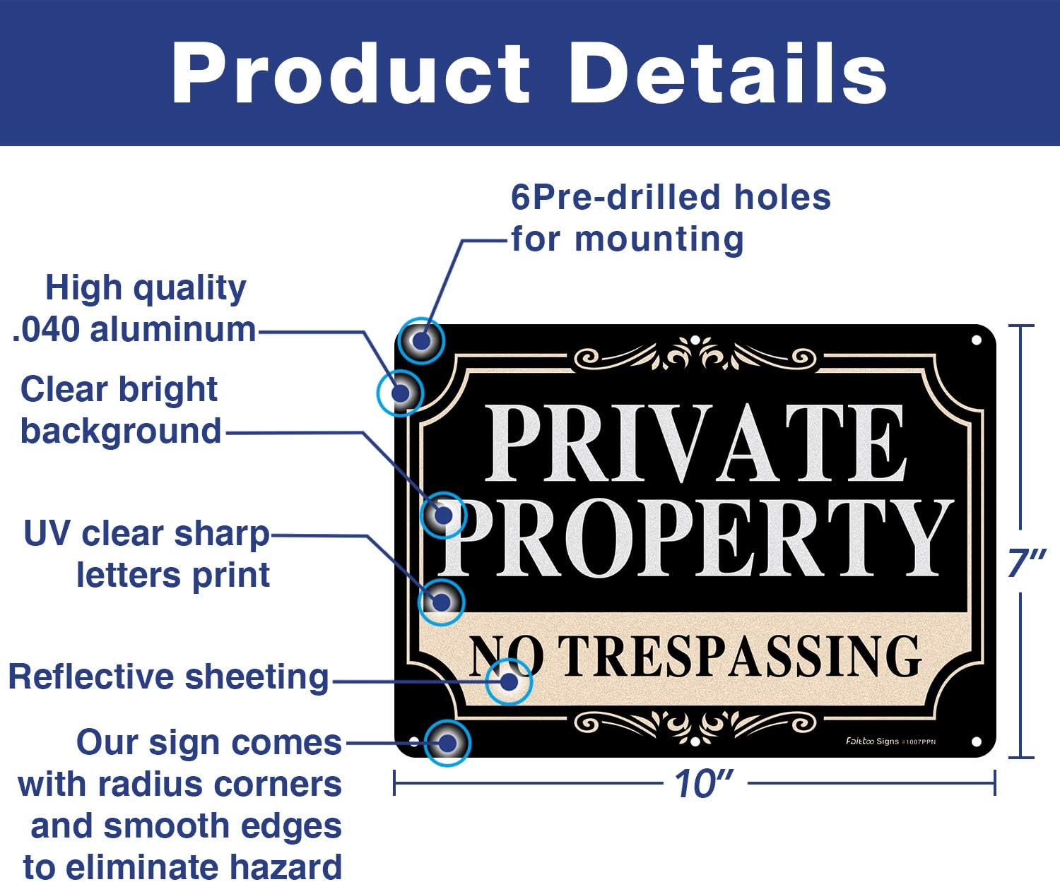 Nice looking: Our Private Property No Trespassing Metal signs are designed in three contrasting colors of white, black and gold, making them more visually attractive and elegant than the others. They states your point against trespassers in a polite way. They fits in very well with your house which is in an upscale neighborhood.