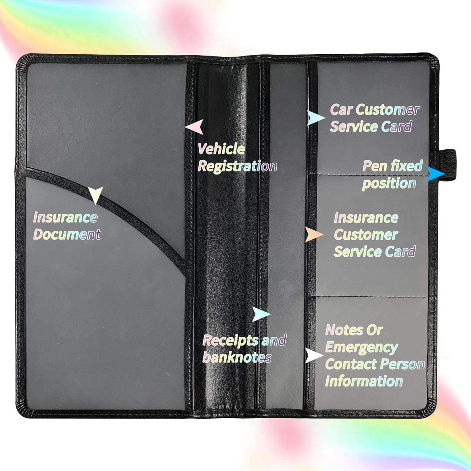 ❁ – The car document holder large pocket for insurance documents and 2 pockets for vehicle registration, 3 small pockets for driver’s license, ID cards, AAA cards, business cards, receipt, key contact information cards, etc.
